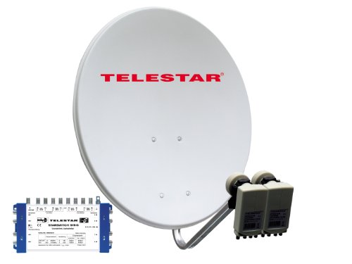 Außenanlage zur gleichzeitigen Versorgung von acht Teilnehmern mit digitalen Satellitensignalen zweier Satellitenpositionen (ASTRA und EUTELSAT).Bestehend aus einem 80cm-Offsetspiegel ( Material Aluminium) mit ALURAPID Schnellmontagemasthalterung, zwei digitalen SKYQUATRO LNBs sowie einem Multischalter TELESTAR STARSWITCH 9/8 G.