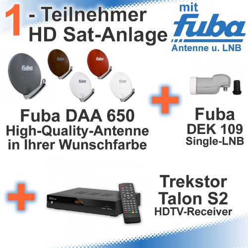 Dieses Angebot garantiert Ihnen digitalen HD Satellitenempfang auf höchstem Niveau. Diese 1 Teilnehmer HD Satellitenanlage besteht aus der mehrfach ausgezeichneten Premiumantenne Fuba DAA 650 in Ihrer Wunschfarbe und dem perfekt darauf abgestimmten Single LNB Fuba DEK 109. Zusätzlich erhalten Sie den HDTV-Receiver Trekstor Talon S2 für optimalen HD-Fernsehgenuss.Feste Bestandteile: