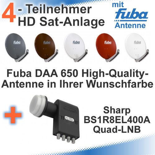 Fuba DAA 650 HD Sat Anlage - 4 Teilnehmer (Sharp Quad LNB) - Sat Anlage bestehend aus Fuba DAA 650 in Ihrer Wunschfarbe + Sharp BS1R8EL400A Quad-LNB