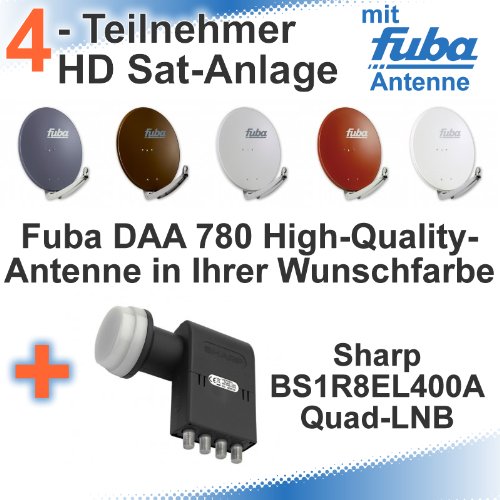 Fuba DAA 780 HD Sat Anlage - 4 Teilnehmer (Sharp Quad LNB) - Sat Anlage bestehend aus Fuba DAA 780 in Ihrer Wunschfarbe + Sharp BS1R8EL400A Quad-LNB
