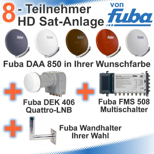 Fuba DAA 850 HD Sat Anlage - 8 Teilnehmer (FMS 508) - Sat Anlage bestehend aus Fuba DAA 850 in Ihrer Wunschfarbe + Fuba DEK 406 Quattro LNB + Fuba FMS 508 + Fuba Wandhalter