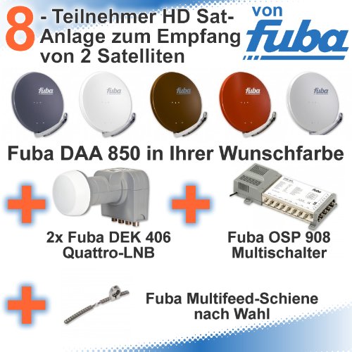 Dieses Angebot garantiert Ihnen HD Satellitenempfang von 2 Satelliten auf höchstem Niveau. Diese 8 Teilnehmer HD Satellitenanlage von Fuba besteht aus der mehrfach ausgezeichneten Premiumantenne Fuba DAA 850 in Ihrer Wunschfarbe und den perfekt darauf abgestimmten Quattro-LNBs Fuba DEK 406. Zusätzlich erhalten Sie einen Fuba OSP 908 Multischalter und eine Fuba Multifeedschiene nach Wahl (DAZ 102 oder DAZ 104).Feste Bestandteile: