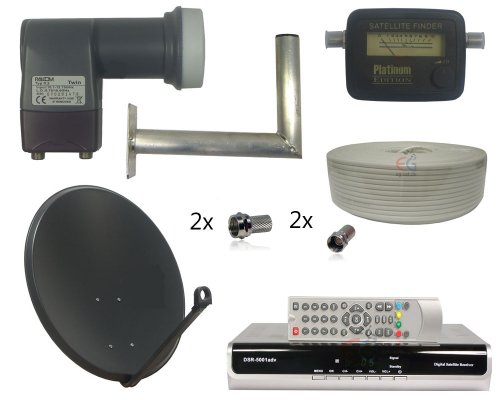 Sat- Anlage für einen Satelliten und zwei Teilnehmern. Das Set besteht aus einem 85cm Stahl-Spiegel , einem Universal Twin, zwei FTA Receivern , Koaxkabel F-Steckern , einem Wandhalter und einem Satfinder